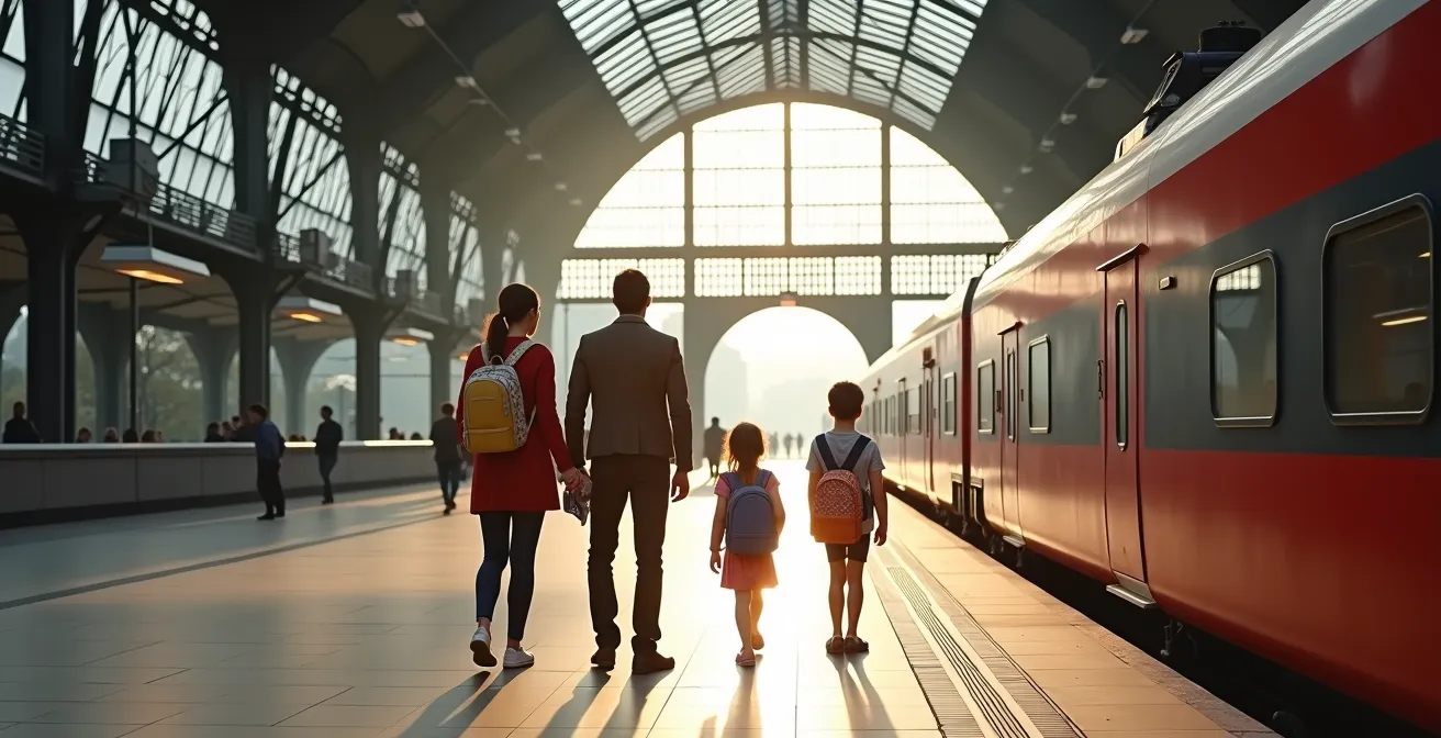 Immagina la scena: binario 9 della stazione di Milano Centrale, un sabato mattina di luglio. Tu, i tuoi due bambini eccitati e tre valigie che sembrano pesare una tonnellata. Il treno è in arrivo e la lotta per caricare tutto a bordo, trovare posto e non perdere di vista nessuno sta per iniziare. Questa non è una vacanza, è una missione logistica. Molte famiglie credono che le uniche opzioni siano viaggiare con il minimo indispensabile, rinunciando a comodità essenziali, o rassegnarsi a questa faticosa realtà. È un compromesso che sacrifica la serenità sull’altare della praticità.
