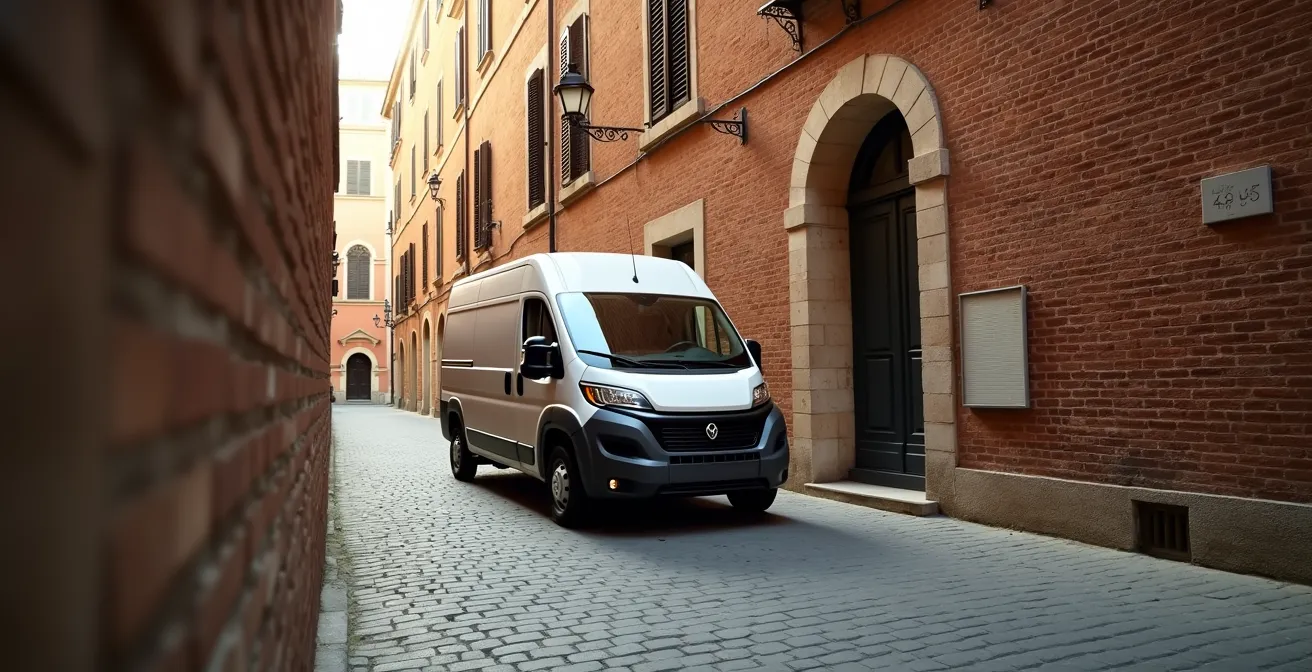 Nel contesto urbano, il tempo è la risorsa più preziosa e scarsa. L’idea che un furgone più grande permetta di effettuare più consegne in un unico giro è un’illusione che non tiene conto del “costo-minuto” operativo. Ipotizziamo che il suo guadagno orario sia di 20€. Ogni 15 minuti persi a cercare un parcheggio o a effettuare manovre complesse le costano 5€ netti. Su una giornata lavorativa, queste perdite si accumulano, erodendo significativamente i margini. Un furgone di medie dimensioni (come un Ducato) può richiedere fino al doppio del tempo per trovare uno stallo adeguato rispetto a un modello compatto (come un Fiorino).